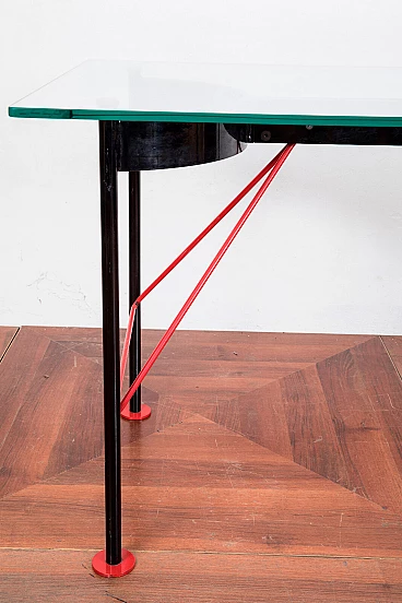 Tavolo da pranzo anni 80. La struttura è in metallo verniciato nero, con dettagli rossi. Il piano è in vetro temperato.