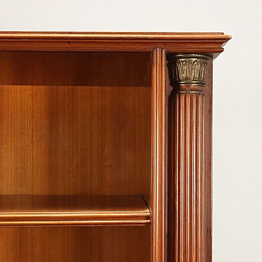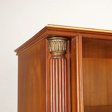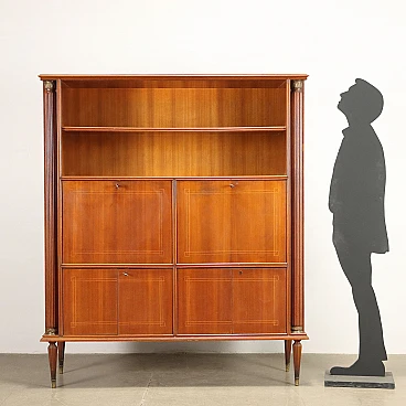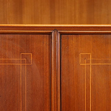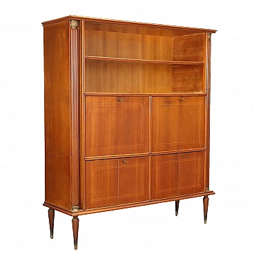 Sideboard with open compartments, hinged and flap doors, 1950s-60s. Mahogany veneered wood structure with decorative inlay thread and brass details. Flap doors become a writing surface and conceal a space with small drawers, compartments and shelves.