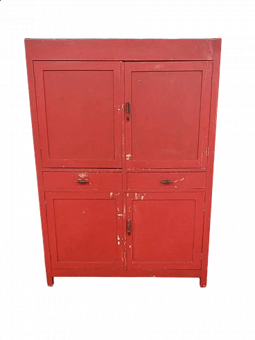 Stained spruce wood sideboard with four lockable doors and two drawers. It has two internal shelves in natural fir. Signs of use but good structure.