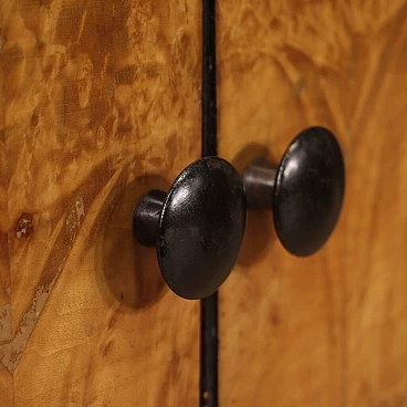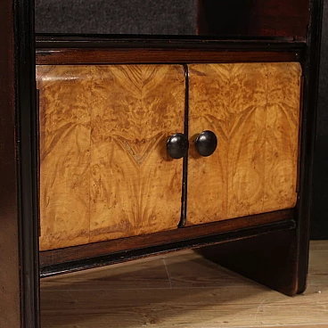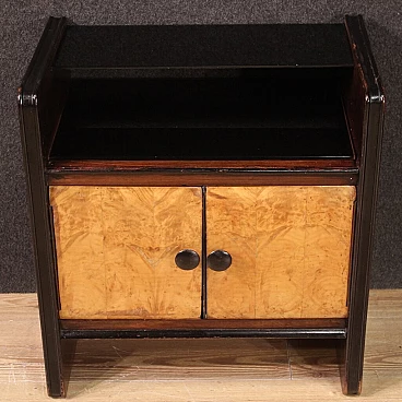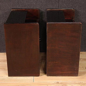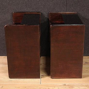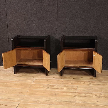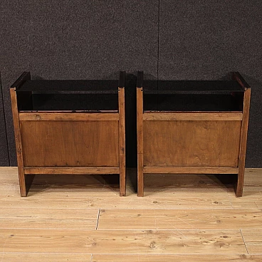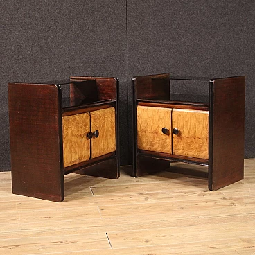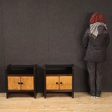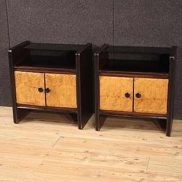Lovely pair of French bedside tables from the mid-20th century. Furniture veneered in mahogany, briarwood, ebonised wood and fruitwood of beautiful line and pleasing decor. Bedside tables in Art Deco style with two matt glass tops of discreet size and service. Shelves with small scratches, signs of wear and tear (see photo). Furniture complete with two doors offering a good capacity compartment inside (see photo). Bedside tables for bedroom or living room of excellent proportion and beautiful decoration, for antique dealers and interior decorators. They show some signs of wear, structurally sound, overall in good state of preservation.