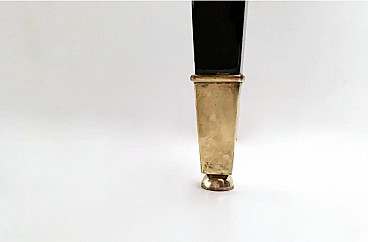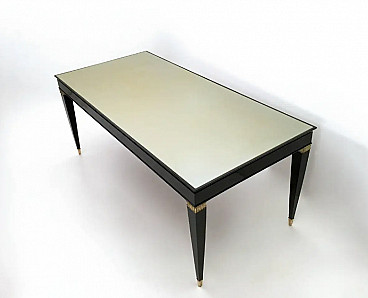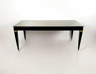 Black lacquered beech table with brass feet and details and dove gray back-painted glass top. As this is a vintage item, it may have minor traces of use, but can be considered in excellent original condition and ready to become a home piece.