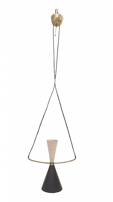 Made of brass and painted steel, it features the original Stilnovo label. It may have slight traces of use as it is vintage, but the wiring is new and can be considered in good original condition and ready to add ambiance to any room. The height is adjustable.