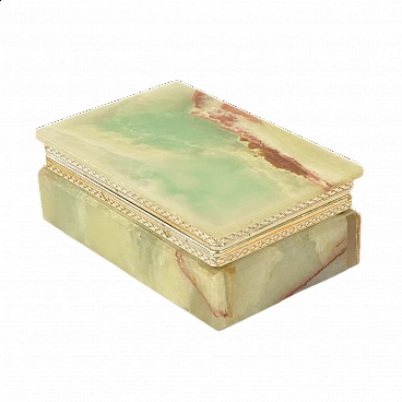 Jewellery box composed of two pieces of alabaster, from Italy in the 1970s. Beautiful coloured alabaster. Stone finished with brass fittings, lined inside with green fabric. The jewellery box was made by hand and is in excellent condition, with slight traces of use. Dimensions: height 4.5 cm; width 11 cm; depth 7 cm.