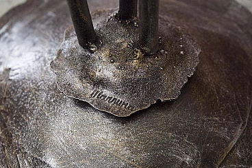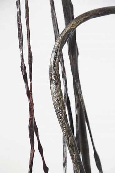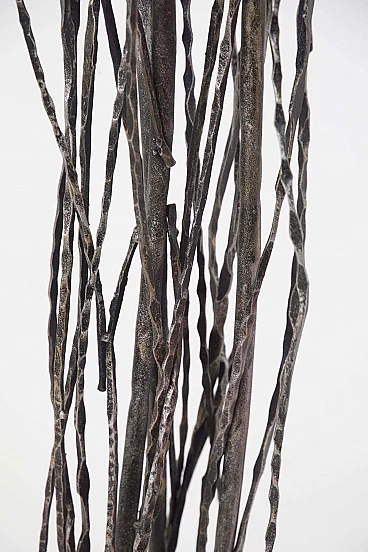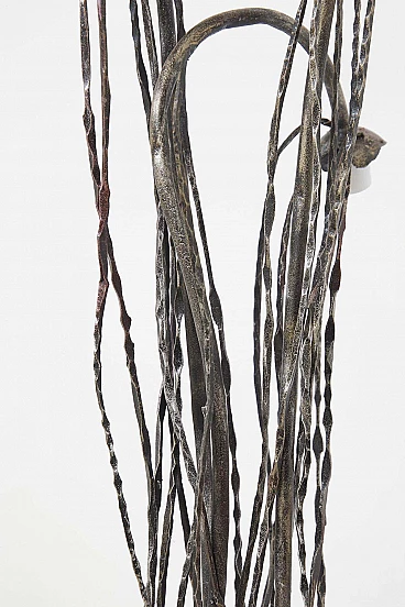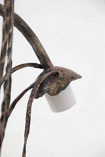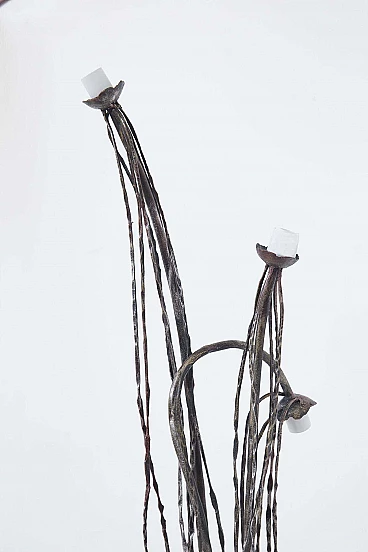 Beautiful Brutalist lamp designed by Salvino Marsura in the 1970s, of fine Italian manufacture. The floor lamp is made entirely of burnished wrought iron, simply fascinating. The base is round, with asymmetrical, typically Brutalist shapes. In the centre it swells to accommodate another circle from which the stems of the lamp will grow. To be exact, there are three large main stems, which are then joined by other small iron tubes to create a splendid effect. The three large stems eventually frame three lights, which look like flowers. Surrounding them are thinner, beautiful wrought iron stems that give a lively and playful effect. The lamp is ideal for eclectic settings.