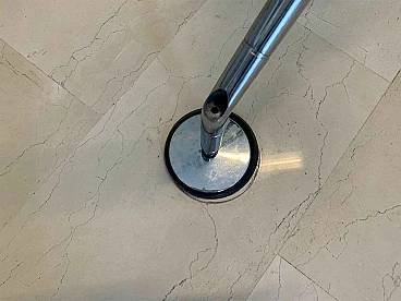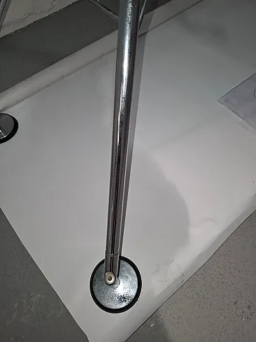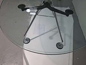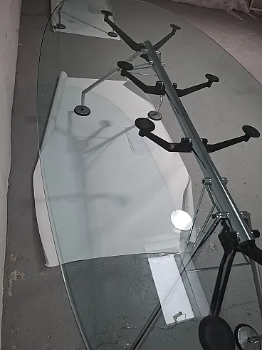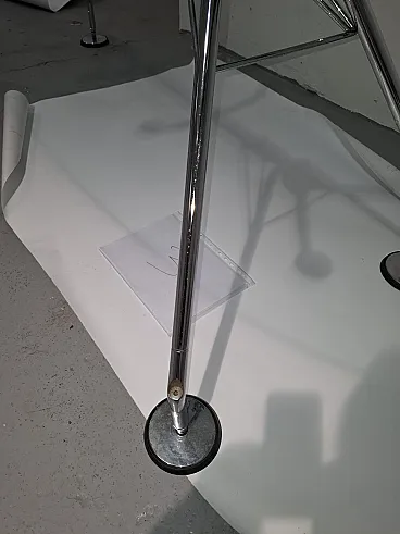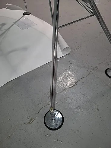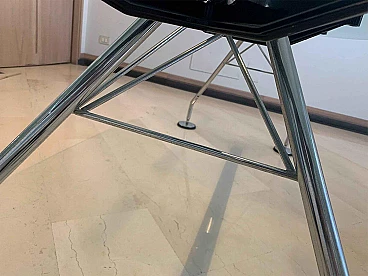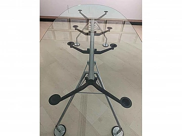 Oval table by Norman Foster for Tecno. It features a tempered glass top and a solid chromed tubular metal skeleton with special suction cups supporting the top. Characterised by a refined, elegant and modern design, it is striking for its unique structure and zoomorphic aesthetics.
