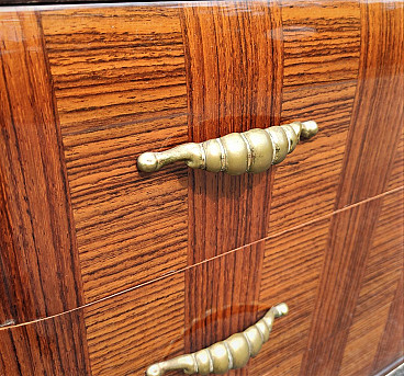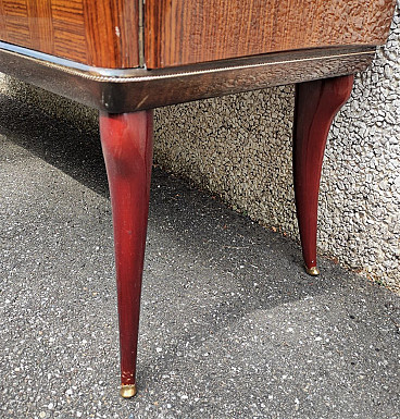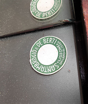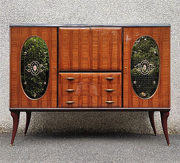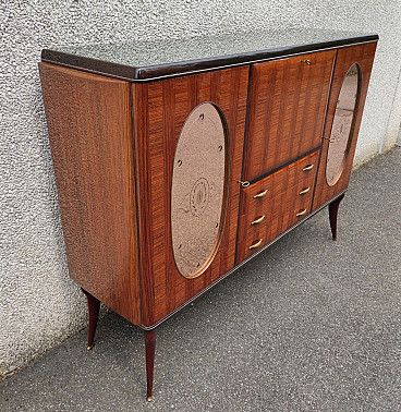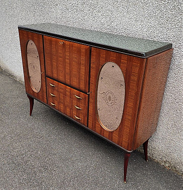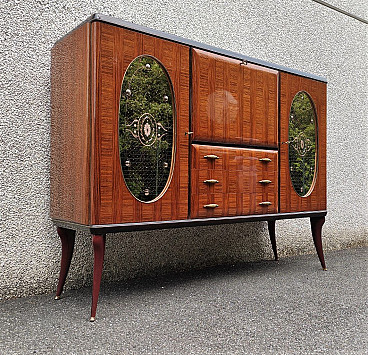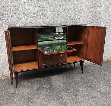 Bar cabinet with doors and drawers. It is characterised at the sides by two long doors, each of which has a mirror decorated with pink glass; the third door opens horizontally and is used to arrange bottles. The compartment is characterised on the inside by further mirrors and a glass shelf. Above the cabinet is a grey/beige glass top. Production by Vittorio Dassi for G. Cecchini e C. di Lissone (label applied to the back, as in the photo). Attached to one of the mirrors inside the bar compartment is the original production label, Santambrogio e De Berti - Lissone. Lissone, 1950s/60s. Very good condition, signs of wear and tear are due to use and time.