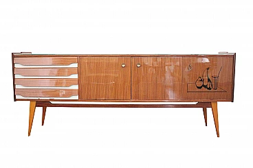 Italian design cabinet from the 60s, composed of 4 drawers on the left side, 2 central opening doors; and one opening door on the right side with black design. The white glass top is not available