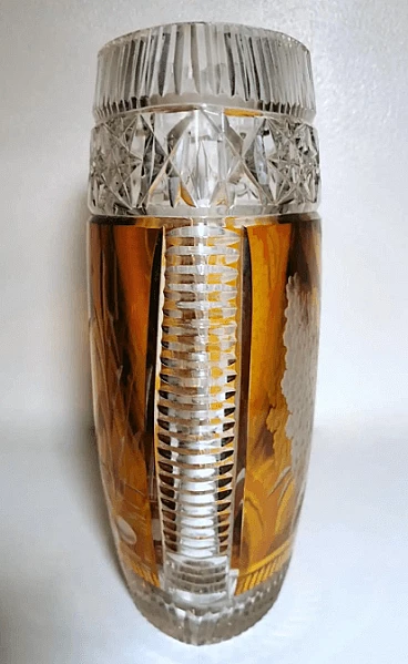 On one side, engraved in a delicate amber colour, one can admire a lake landscape with an elegant swan in the foreground, while on the other side one can appreciate a beautiful set of pretty plants with leaves; on the upper part of the vase the color is absent to give space to a wonderful and strong crystal grinding with stars and stripes. The vase was masterfully executed between 1948 and 1951 in an artisan workshop in the Nancy district (France), famous for the high concentration of factories and craftsmen specialized in crystal processing (Daum, Baccarat, Saint Louis, etc.) ; the vase is made of crystal with a percentage of over 30 percent lead oxide (a material developed in England by George Ravenscroft in the second half of the 17th century), very shiny and transparent; to obtain the delicate amber colour, iron oxide and sulfur were added to the crystal during casting. The glass masters then modeled the final shape, once cooled, they cut and scrupulously polished the edge in a decorative way, while the body was embellished with a graceful grinding done by hand and with meticulous care using small circular stone wheels; In doing so, a fascinating and pleasant contrast was created between the ground parts and the rest of the colored vase; finally, the vase was polished with a cork bark wheel dipped in a mixture of water and pumice and, finally, the polishing phase, obtained with a felt wheel dipped in a mixture of water, iron oxide and cerium. Our vase, with its delightful and graceful shape, tells us these wonderful stories, it is an object with a unique identity, full of elegance and refinement; moreover, the excellent quality of the crystal gives the object a high refractive index and creates extraordinary plays of light and reflections.