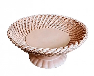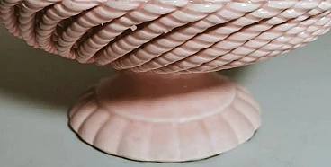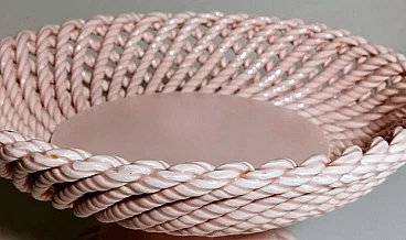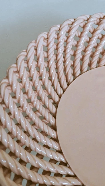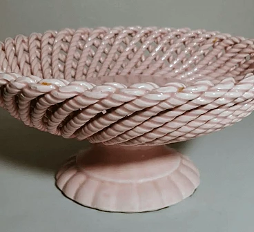 The object was made entirely by hand, the craftsman used terracotta in its plastic state, turned the base and an overlying circular surface with a pedal lathe, then performed with masterful skill and infinite patience an intertwining of earthenware, as if making a wicker basket; he then assembled everything, creating the centerpiece in the desired shape; the artifact was left to dry for a long time so that the residual water could evaporate from the clay; once the drying process was finished, the object was finished and sponged with water to eliminate imperfections and increase its porosity, then it was placed in an oven for a first firing of about 12 hours at 1000 degrees Celsius (biscuit firing), which was followed by a subsequent gradual cooling of the oven which occurred naturally by heat dissipation; at this point the object was subjected to the ancient technique of enamelling, performed manually by immersion in an aqueous solution of pink enamel; this phase requires great skill, as it is important that the enamel is deposited uniformly on the surface. To definitively fix the dye, a final firing was then carried out in the oven. The centerpiece was made between 1950 and 1955 in an artisan workshop in the south of France, near the city of Uzes; this area is famous for this type of processing of the particular local terracotta.