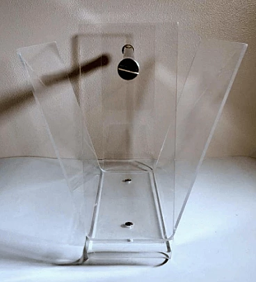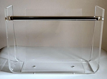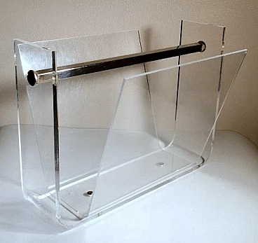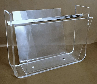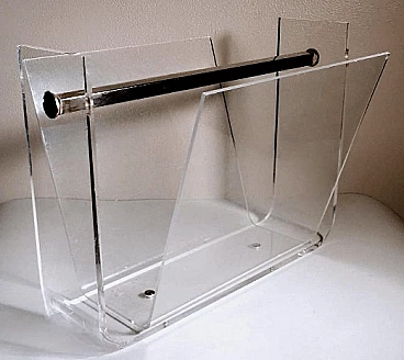 Magazine rack made in Space Age style by hot stamping two sheets of transparent plexiglass which give it a sinuous and soft shape. The plates are fitted one inside the other and are joined to the bases with two large and showy chromed screws. In the inner part, an elegant and massive chrome-polished brass bar with a square section has been placed at the top, which acts as a handle for the entire object. The measures are aesthetically proportionate and pleasant. The magazine rack was born in an innovative laboratory in the province of Milan between 1970 and 1974. The craftsmen of those years, tired of conventional materials that didn't allow them to go too far with their imagination, turned to plexiglass for its extraordinary versatility and ease of processing that allows them to create elegant, extravagant and modern products by rewriting the rules of contemporary design of the 1970s. From those skilled hands and creative minds are born lamps, chairs, tables and coffee tables, vases, magazine racks and much more. The Space Age style originated in the early days of the space age, identified as being attributed to the launch of Sputnik in October 1957, and continued through the 1970s. The objects of this period are reduced by essential volumes that recall geometric shapes, definitively breaking with the rationalist tradition. Plexiglass also made its appearance in those years on the design market, stimulating the interest and creativity of many famous designers and brands who, between the end of the 1960s and the 1970s, created truly innovative objects, populating architecture and fashion magazines. Plexiglass also conquers everyday life by giving an original and contemporary aesthetic to the objects that accompany us every day, trapped for a long time in traditional canons. Plexiglass is a plastic material, whose "real" name is polymethyl methacrylate (PMMA) or more simply methacrylate, derived from the name of its structural polymers. Plexiglass is the best known trade name, used today. The inventor of this material is Otto Karl Julius Röhm, a German chemist who made it in 1928 and which was marketed in 1933 by the German Röhm industry. In 1936, the first acrylic sheet was made with the name Perspex, which means "see through". In fact, one of its most appreciated characteristics is its transparency and it is often used as an alternative to glass also due to its unbreakability. These characteristics, combined with the fact that it is a ductile and versatile material, mean that plexiglass lends itself easily to different types of processing and is used in different sectors. It is also known under the trade names of Plexiglas, Perspex, Amanite, Lucite, Trespex, Vitroflex, Acrivill, Perclax, Limacryl, Crylux, Oroglas, Setacryl, Altuglas. It is sensitive to scratches and abrasions but they can be easily eliminated thanks to specific products.