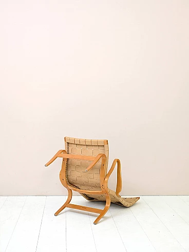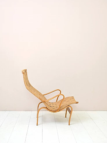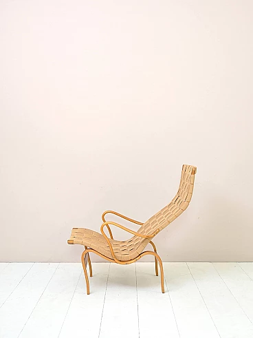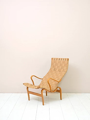 Iconic Pernilla armchair designed by Bruno Mathsson for Karl Mathsson AB in Värnamo, Sweden in the 1940s. The frame is made of birch wood and the seat of canvas with crossed straps. Good condition. The colour of the canvas of the armchair is slightly lighter than that of the footrest. It may show signs of time. Please pay attention to the photos.