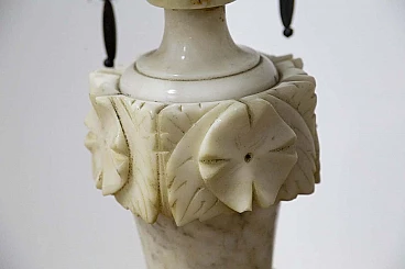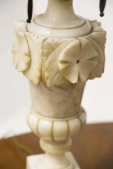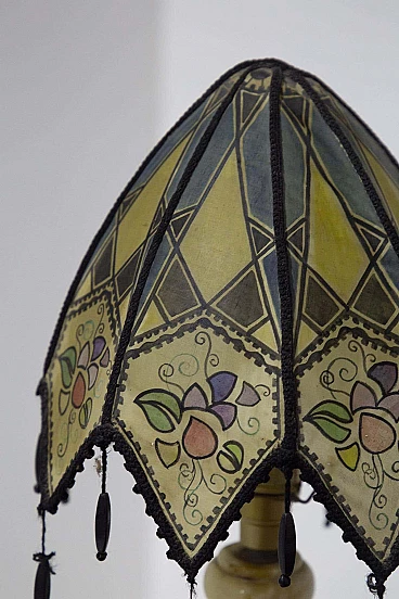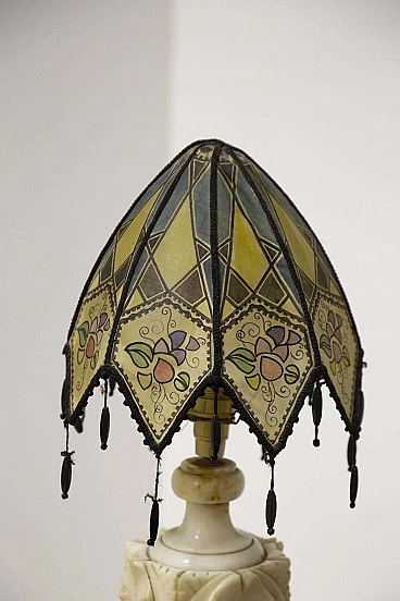 A splendid Italian table lamp designed and produced by fine Italian manufacturers in the 1930s. The lamp has a base carved from a block of antique marble, ivory in colour. It has a square base, on which rests a marble cube, above which is the actual stem. A chiselled and sinuous base then rests on a flower-shaped structure. Here, a gradually widening marble vase appears to emerge. At the apex is a frame of four beautiful flowers and leaves. Above it narrows to form the cap of the lamp. The latter is made entirely of coloured art glass; a strange mushroom shape but with V-shaped tips. Very elegant. Each slice is divided by black cotton threads, which dangle a black cotton element at the end. The glass is mainly golden yellow on which small flowers and eye-catching geometric patterns have been drawn. The lamp is very beautiful and can be placed in high-class surroundings.