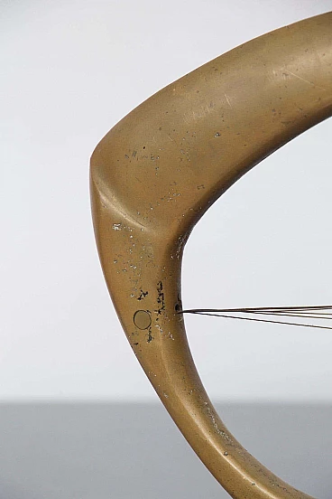 Wonderful sculpture from the 1980s designed and made by the great painter Meloniski from Villacidro. The painter Meloniski was born in Villacidro in 1943. Completely self-taught, the Sardinian artist moved to Paris in 1969 and then to Milan. He currently lives and works in the Lodi area, where Meloniski devotes himself mainly to sculpture in marble, bronze and wood, as well as painting and ceramics. One cannot separate Meloniski the artist from Meloniski the craftsman. The artist ferments his imagery, polarising its integral symbolism; similarly, the craftsman controls the primordial elements inherent in the material. Close to organic drives, to the instincts of tactility, Meloniski has developed the three paths of his research: sculpture, ceramics and painting. His sculpture was a knowledge of stone, wood and metal (the three elements of the earth). In this case, it is a kinetic sculpture with a round silver-plated metal base at the centre of which is a slender rod that supports the actual body of the statue. This has an elongated shape, reminiscent of a leaf, the base of which is made of a very durable light-coloured wood. The following is made of brass, with some wear and tear from time. In the centre, strings can be seen sprouting out, creating an attractive geometric play. The sculpture is suitable for collectors.