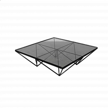 Low table with black painted metal trellis frame (original paintwork, shows slight signs of wear) and glass top.