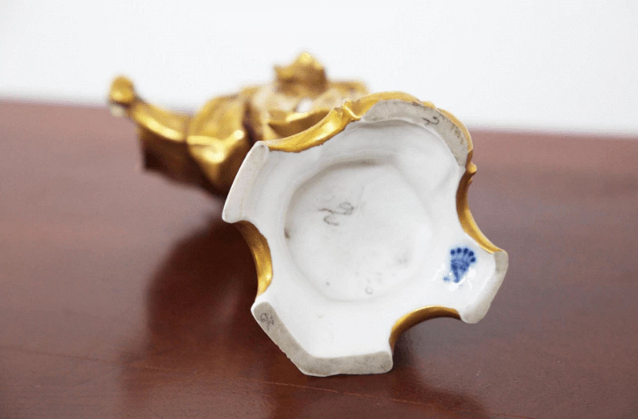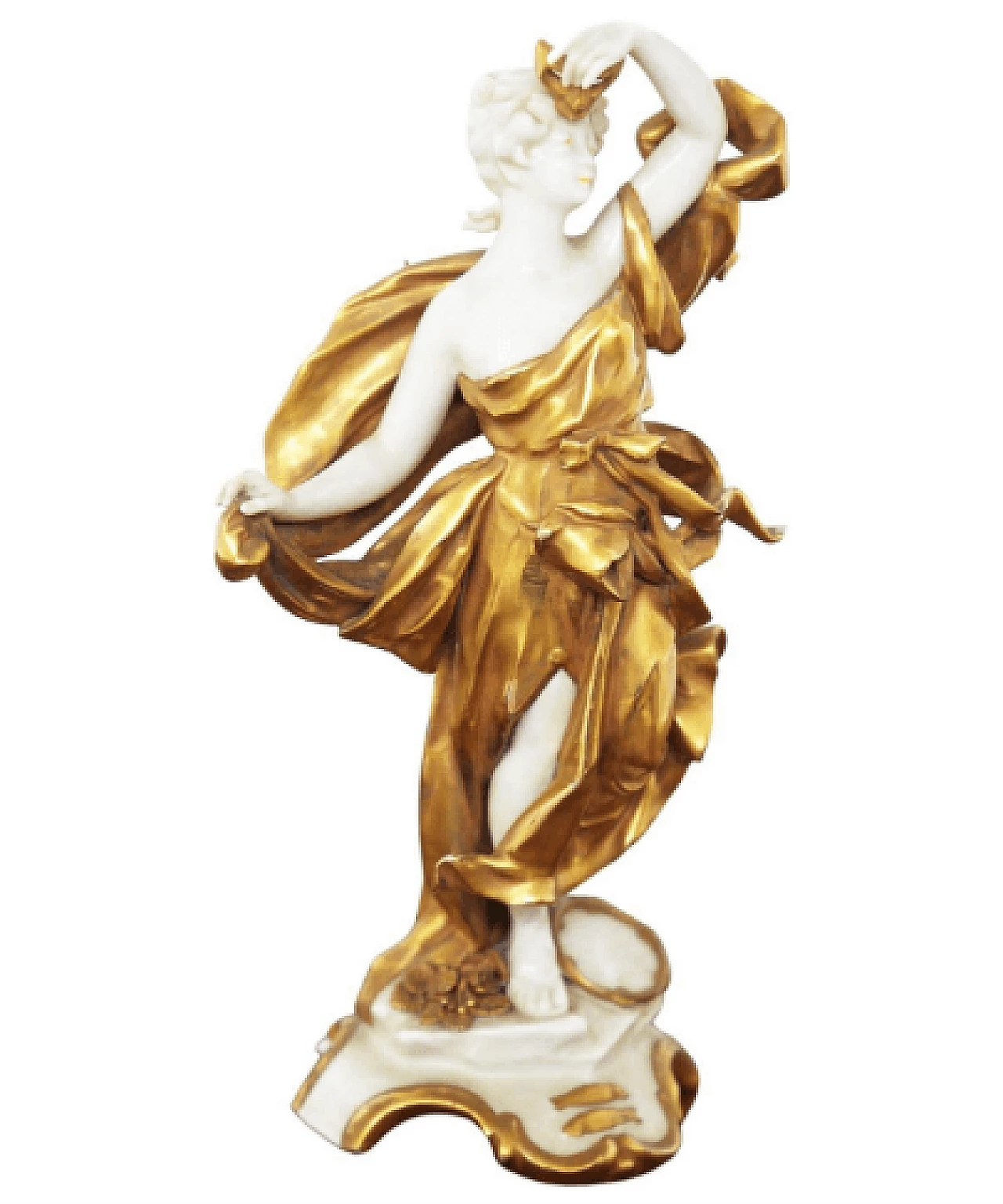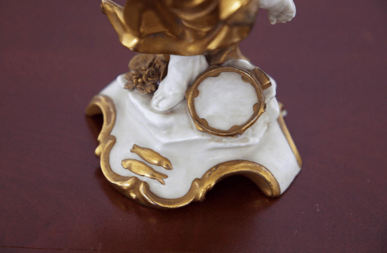 Pisces statuette in white and gold Capodimonte ceramic belonging to a collection dedicated to the zodiac signs, early 20th century. The sign is represented as a female figure with a mask in her hand and a tambourine at her feet: these objects refer to the creativity, imagination and emotion of Pisces. The mask, which refers to the inner self being revealed, connects to the compassionate and intuitive nature of the sign; the sound of the tambourine refers to the sign's need to explore the unknown through creative endeavors. Together these symbols emphasize Pisces' connection to their inner world while encouraging them to strive for growth and exploration.