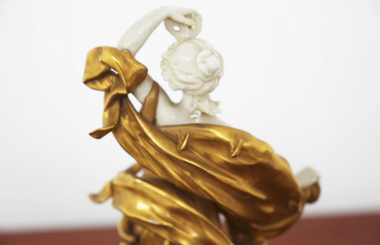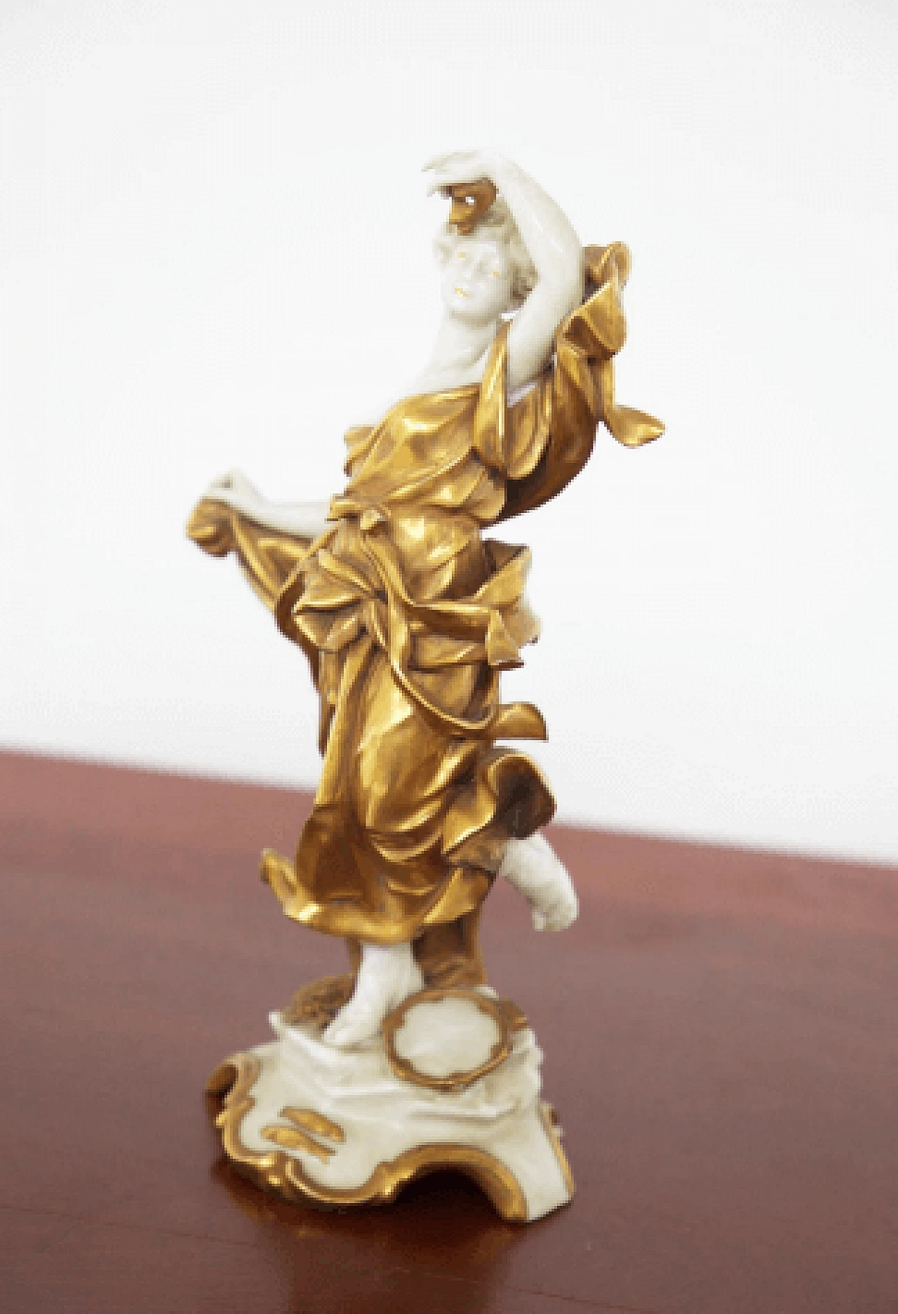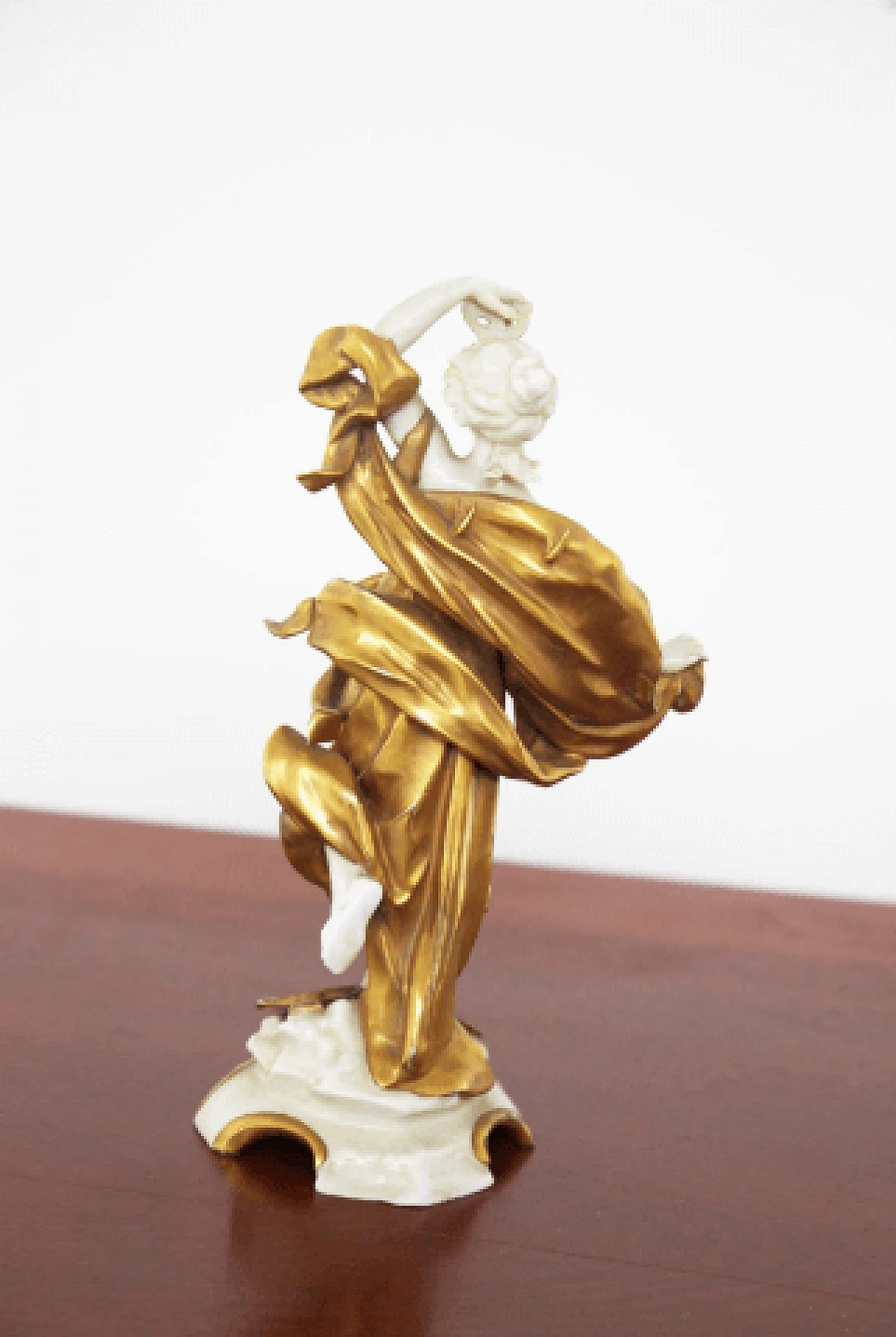 Pisces statuette in white and gold Capodimonte ceramic belonging to a collection dedicated to the zodiac signs, early 20th century. The sign is represented as a female figure with a mask in her hand and a tambourine at her feet: these objects refer to the creativity, imagination and emotion of Pisces. The mask, which refers to the inner self being revealed, connects to the compassionate and intuitive nature of the sign; the sound of the tambourine refers to the sign's need to explore the unknown through creative endeavors. Together these symbols emphasize Pisces' connection to their inner world while encouraging them to strive for growth and exploration.