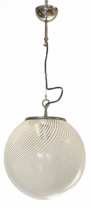Chandelier with adjustable steel structure and spherical white and transparent striped glass lampshade, 1970s.