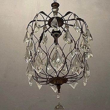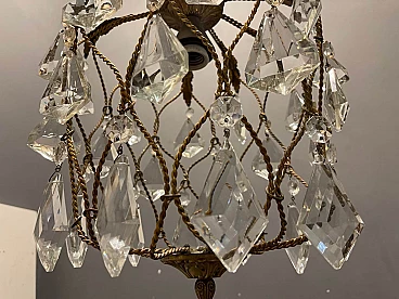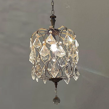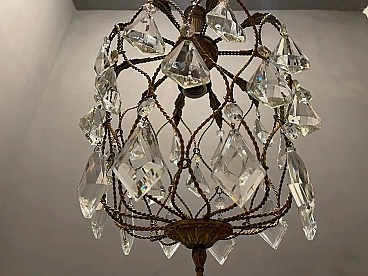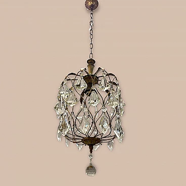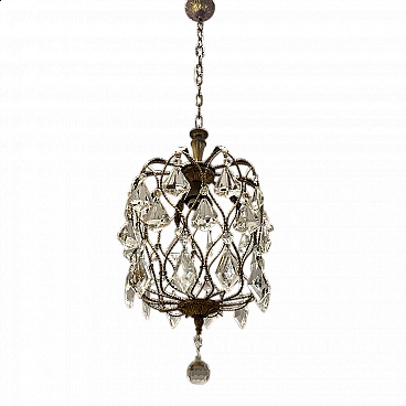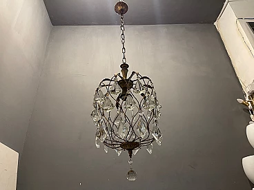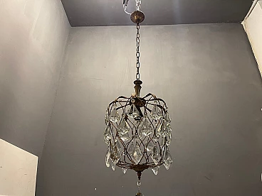 Metal chandelier with crystal droplets, 1950s. It requires an E27 bulb. It has been rewired and is compatible with Europe, UK and USA. Total height: 108 cm. Height excluding chain and canopy: 60 cm.