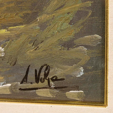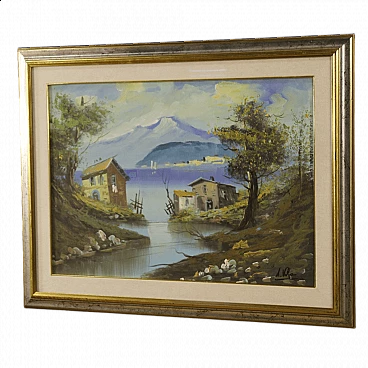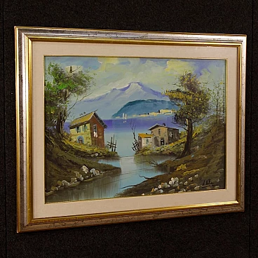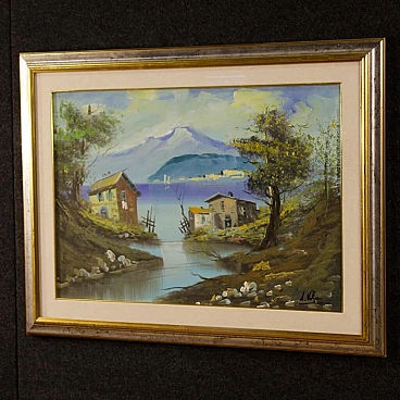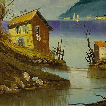 Lake view with houses, oil painting on canvas