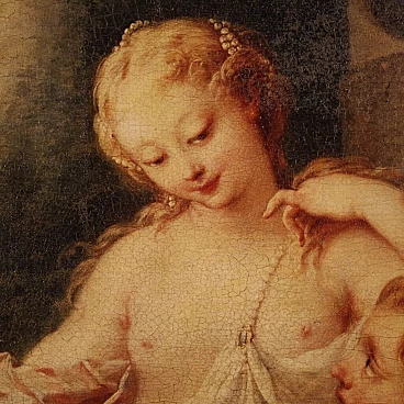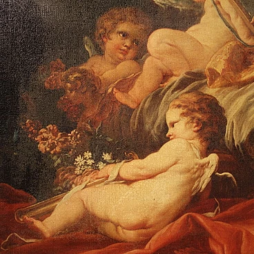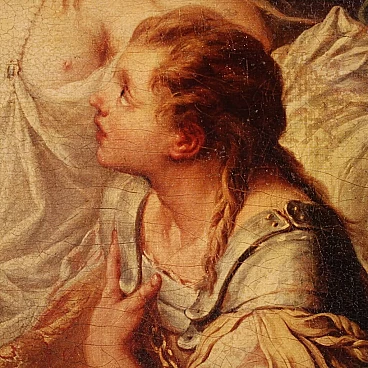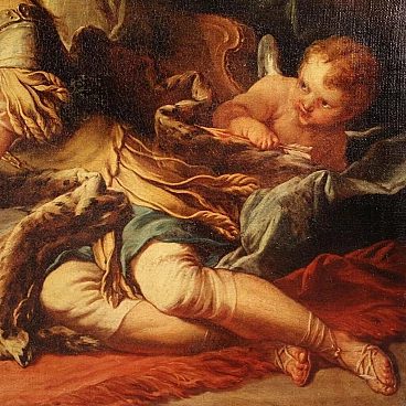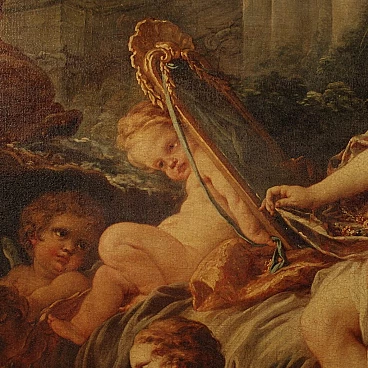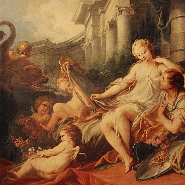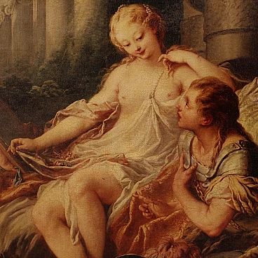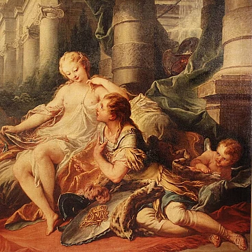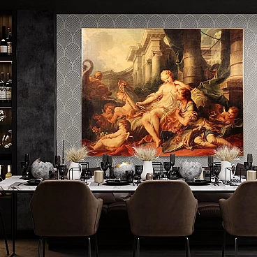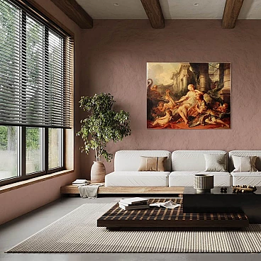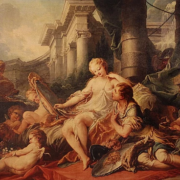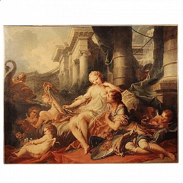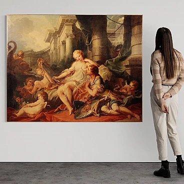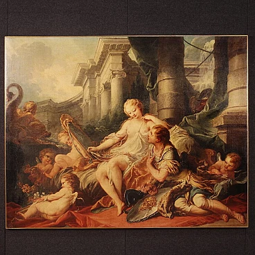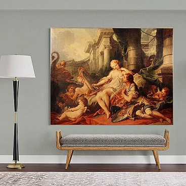 Coloured print applied on canvas with wooden frame, modern decorative work from the 1980s. Print depicting mythological subject, copy of the famous painting by Francois Boucher, Rinaldo e Armida. A fabulous decorative print, ideal for insertion in a salon, living room or waiting room, for decorators and interior decorators. An object of great size and beautiful decoration characterised by excellent luminosity and warm colours. Print on canvas mounted on wooden frame, adorned with gilded wooden frame applied to the side of the frame (see photo). Work shows some minor signs of time, overall in good condition.