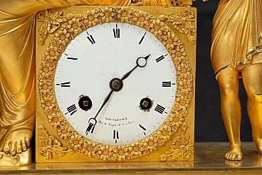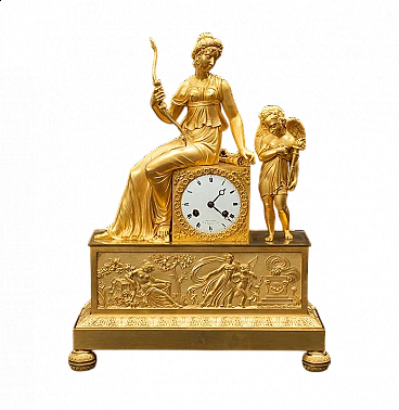 Finely chiselled gilt bronze Empire clock belonging to the early 19th century. The scene centres entirely on the figure of Diana the huntress flanked by a small putto. The figure on the left is depicted with a bow in her hand and her hand resting on the ferrule, while the putto holds the flame of hope. The lower part is decorated with allegorical scenes relating to the life of Diana. The dial is made of porcelain and bears Roman numerals with a signature 'DOUTREUWE A PARIS' in the centre. Complete clock with key and pendulum and perfectly functioning mechanism. Provenance: France (1820/30). Measurements: 40 x 17 cm, H 53 cm. Accompanied by a certificate of authenticity. We are at your disposal for further clarification or photographic details. Shipping throughout Italy, Europe and the rest of the world with maximum security and traceability. Shipping will be arranged privately.