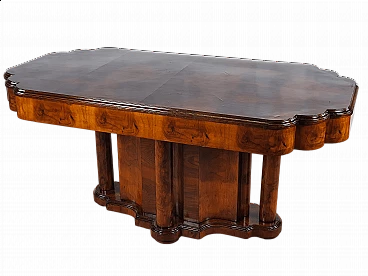 Art Deco walnut root table, 1940s-50s. Shaped top supported by a base carved at the edges and with columns on the sides. It has been polished with oil and shellac.