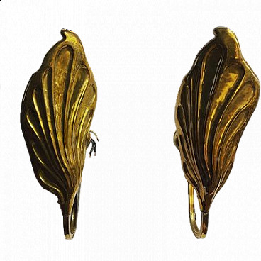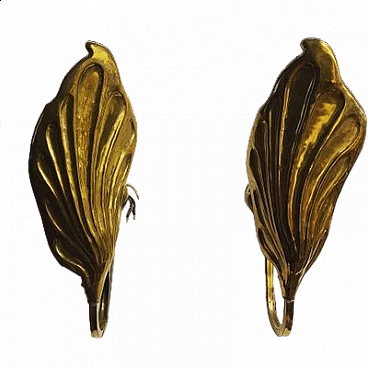 Pair of leaf-shaped brass wall sconces. Italy, 1970s. Often attributed to the Italian designer Tommaso Barbi, known for his extravagant works characterised by organic shapes, particularly leaf-shaped brass lamps. In working order.
