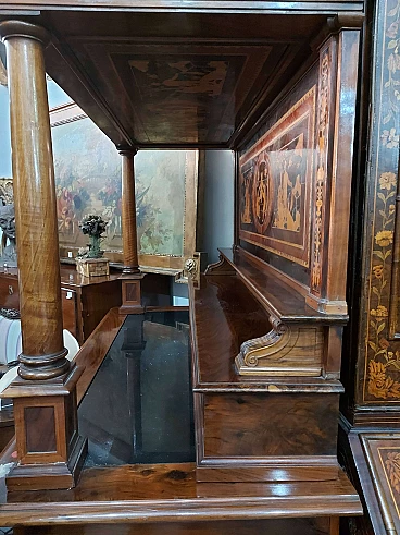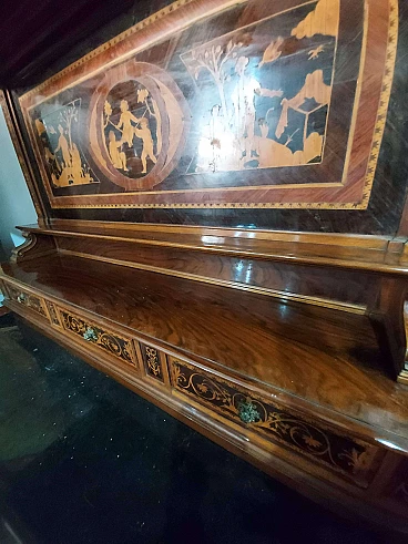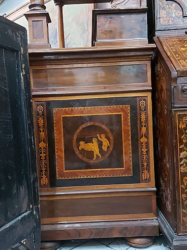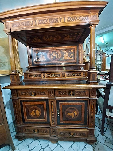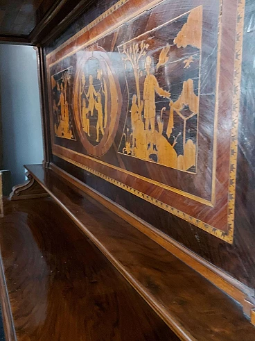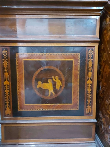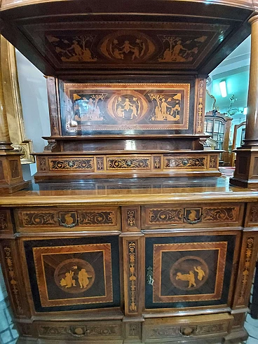 Beautiful sideboard with rosewood riser finely inlaid with precious woods in the Maggiolini style, 19th century, Italy. A sideboard of great elegance and visual impact, floral decorations and country scenes with peasants and cherubs, the two columns on the riser with three smaller drawers, two larger drawers positioned centrally above the two low doors opening onto two shelves, working keys. Giuseppe Maggiolini was a master cabinetmaker at the court of first the Habsburgs of Austria and then Napoleon Bonaparte. His are the decorations and furniture for the Villa Reale in Monza.