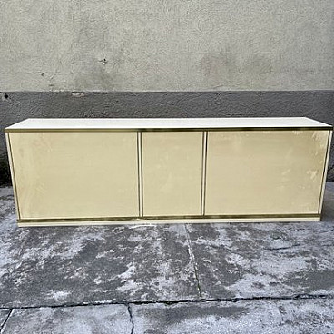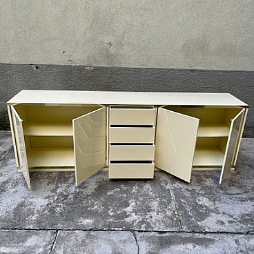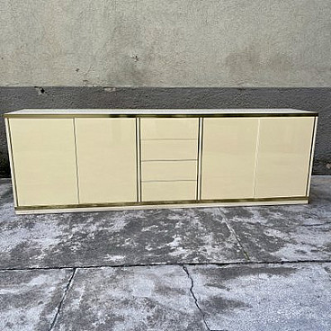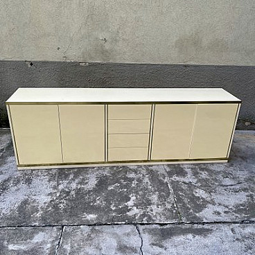 This sideboard, made of ivory laminate and embellished with brass edging and details, has doors and drawers with push-pull openings. It is part of a complete set, consisting of it, a table and four chairs.