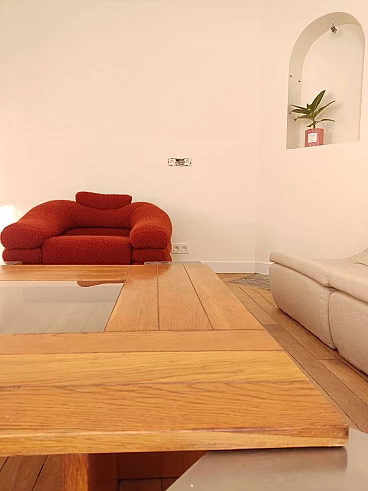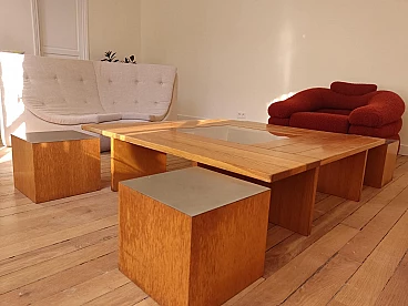 Wood, steel and glass coffee table with four stools by Tecno, 1970s