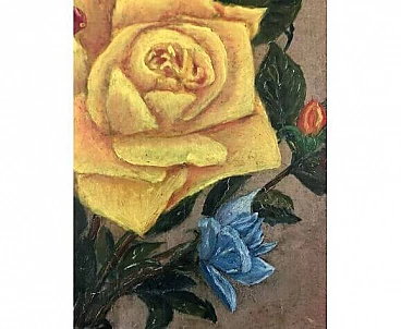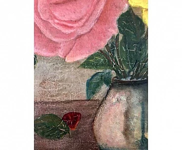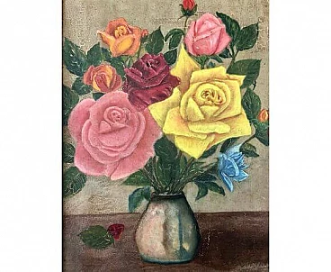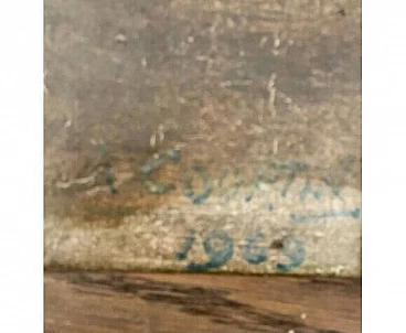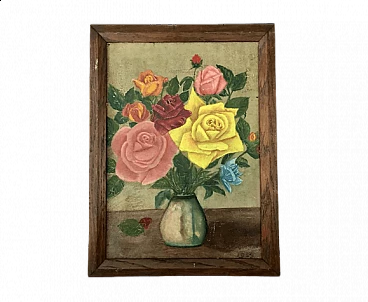 Vintage French oil painting on canvas depicting a bouquet of wild flowers consisting of poppies, daisies, morning glory, ears of corn, berries, etc. In a traditional iced jug. Two apricots and a peach on the table next to the jug add a still life element to the composition. It is signed at lower right and dated 1969. Framed in a wooden frame with linen lining, the painting is in very good condition, apart from a slight wrinkle on the canvas in the upper left corner and some signs of age on the frame and lining. See detailed photos on this page. This painting will be an authentic French addition to your décor or collection. Dimensions 45 X 35 cm. Weight 1022 g.