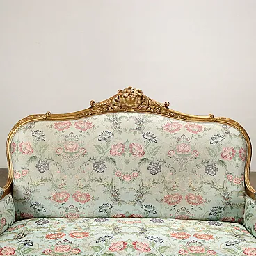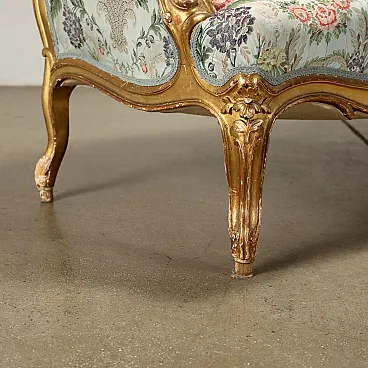 Neo-Rococo style sofa in carved and gilded wood, Italy second half 19th century. Upholstered back, seat, armrests and wavy legs decorated with curl motifs, pair of shells and festoons of leaves and flowers. Curl of one armrest damaged.