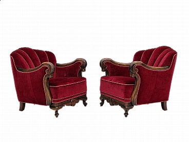 Pair of armchairs made in Denmark in the 1930s. Ash structure, brass spring seat, red velvet upholstery original of that period.