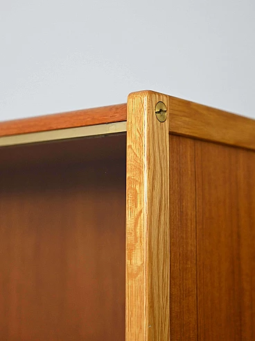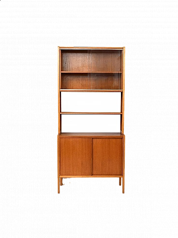 Scandinavian teak bookcase with oak borders, 1960s. The lower part consists of a cabinet with wooden sliding doors while the upper part is closed by sliding doors also but made of glass. It has been treated with products of natural origin.