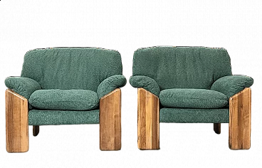 Pair of armchairs produced by MobilGirgi in the 1970s, design by Mario Marenco, Sapporo line. The armchairs are of Italian manufacture, completely restored. New interior in moulded foam, upholstery in sage green curly fabric. Beautifully designed with angled front legs that extend to the sides and back, the back support is slightly curved. The frame is made of geometrically shaped walnut. The rich wood grain contrasts beautifully with the sage green upholstery. Perfect condition. Height 88 cm, width 94 cm, depth 87 cm, seat 55 x 50 cm, seat height 45 cm.