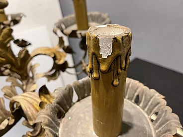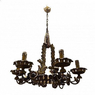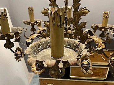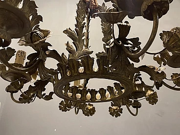 Large antique Tole flower chandelier from the 1940s. Height with chain and ceiling canopy 100 cm, height without chain and canopy 64 cm, width 76 cm. Wiring checked by our warehouse electrician. The original candle holders show damage on the outside, but we have chosen to leave them because they are an antique item.
