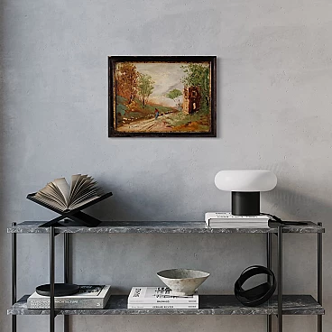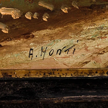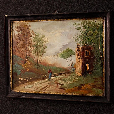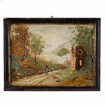 A. Monti, landscape with figure and architecture, oil painting on masonite