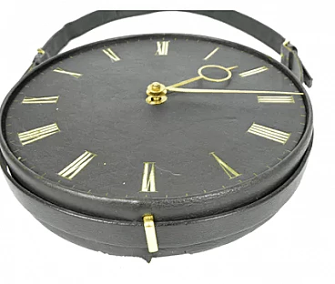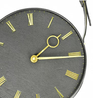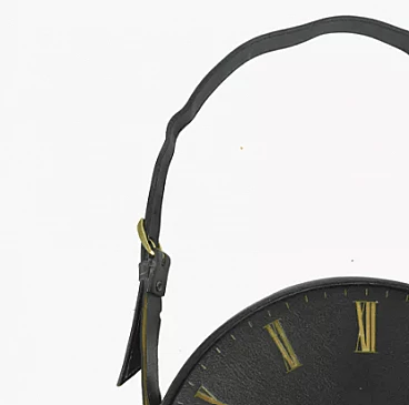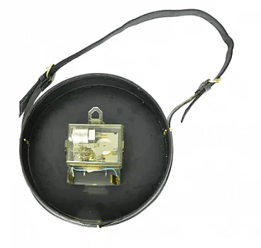 Modernist style wall clock made in the second half of the last century by the German company Silvos. A steel watch with a brass fitting, a painted dial, all covered in leather, whose appearance is inspired by a women's handbag. Hanging cable clock. The item is functional, original, in good condition. The quartz movement runs on a single rl14 battery. Dimensions: height 43cm; width 22cm; thickness 5cm; dial diameter 21 cm.