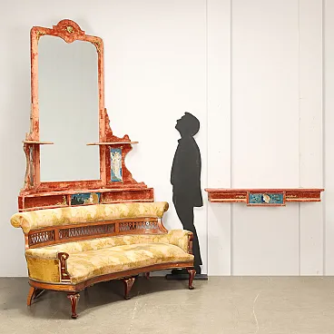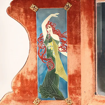Art Nouveau corner sofa with mirror and shelf, made between the late 19th century and the early 20th century. Mahogany sofa with gilt floral carvings and openwork back. Seat and backrest in original floral patterned fabric of the period. Riser upholstered with red velvet with mirror and Viennese ceramic tiles depicting female figures with references to the world of dance and music. Gilt bronze decorations. It shows minor damage and missing parts.