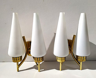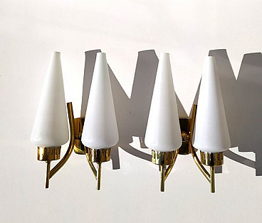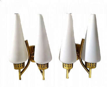Pair of two-light wall lamps by Angelo Lelli for Arredoluce, 1950s. Brass structure and milk glass light diffusers.