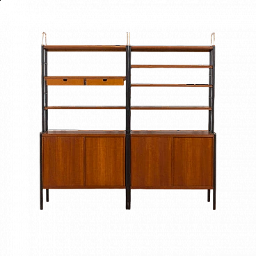 A set of two freestanding teak 'Variett' bookcases, designed by Bertil Fridhagen for Bodafors in the 1950s Sweden. It is a remarkable example of mid-century Scandinavian joinery, combined with elegance and functionalism. Both bookcases have a black painted wooden frame with decorative brass screws and details, giving a unique impression. Each unit consists of adjustable components, described in detail below, that allow you to arrange it according to your needs, and a cabinet with sliding doors, which provides enough space for storing books and decorations. All can be freely exchanged. The wall units fit both together and separately as functional furniture, even in two separate rooms. The first unit consists of: 2 shelves 24 cm deep; 1 shelf with two small drawers (height of the drawers 5.5 cm); cabinet with sliding doors and an internal shelf; H: 50 / W: 80 / D: 40cm. The second piece of furniture is made up of: 4 shelves 24 cm deep; cabinet with sliding doors and an internal shelf; H: 50 / W: 80 / D: 40cm. Overall, fantastic original vintage condition with minor traces of use and a clean interior.