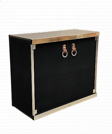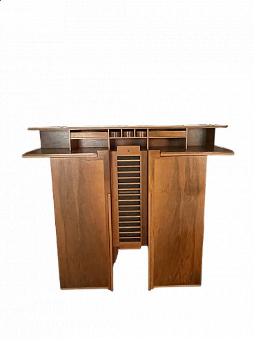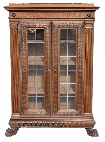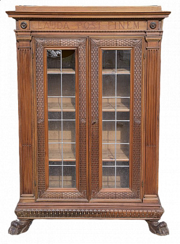 Sideboard/showcase/bookcase with lion-shaped foot and Latin inscription "LAUDA POST FINEM" engraved on the upper part, two doors with leaded English-style glass (one of which is broken), four carved lion-shaped feet. The piece of furniture has a particularity made on commission: in the upper part we find a trapdoor hiding opening with two compartments that were used to hide the silver cutlery.