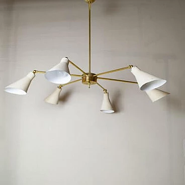 Light chandelier with aluminium shades and brass frame in the style of Stilnovo Models, 1950s