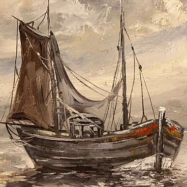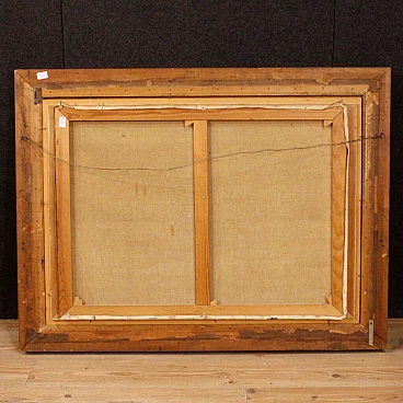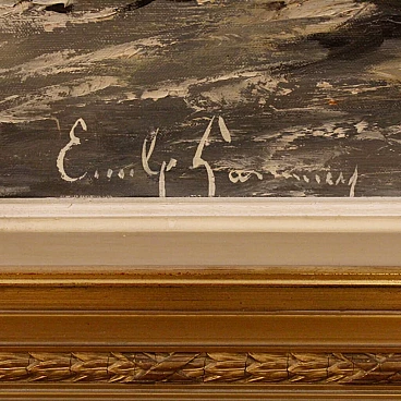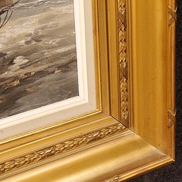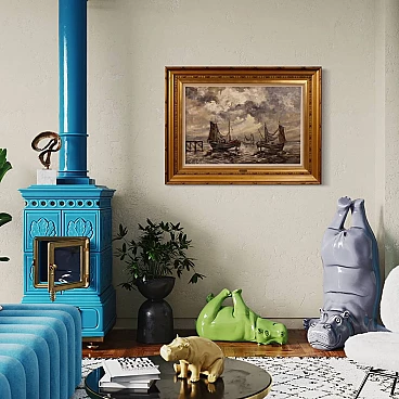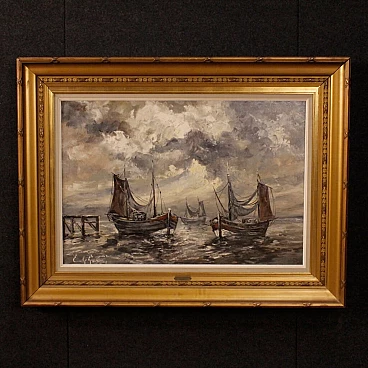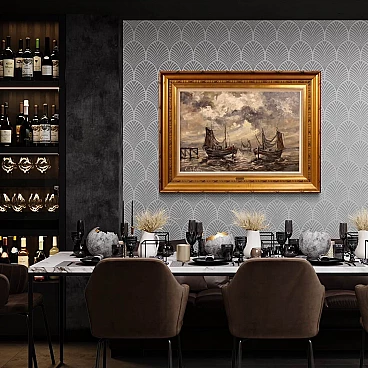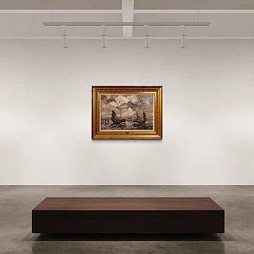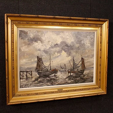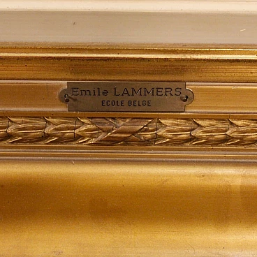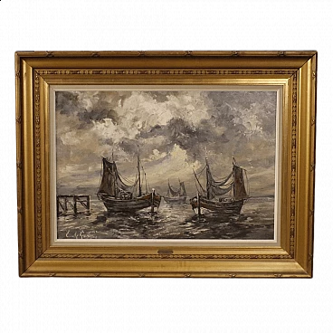 Large Belgian painting from the mid-20th century. First oil-on-canvas work depicting navy with boats in Impressionist style. Wooden and plaster frame with wooden passe-partout, richly carved and gilded, beautifully decorated. Painting of great size and impact, for antiquarians and collectors, signed lower left (see photo) Emile Lammers (1914-1990) lacking authentication or additional documentation. Fabulous piece of furniture, easily placed in various places in the home. In good condition. Light painting: H 63 x W 95 cm.