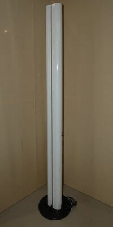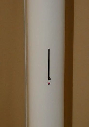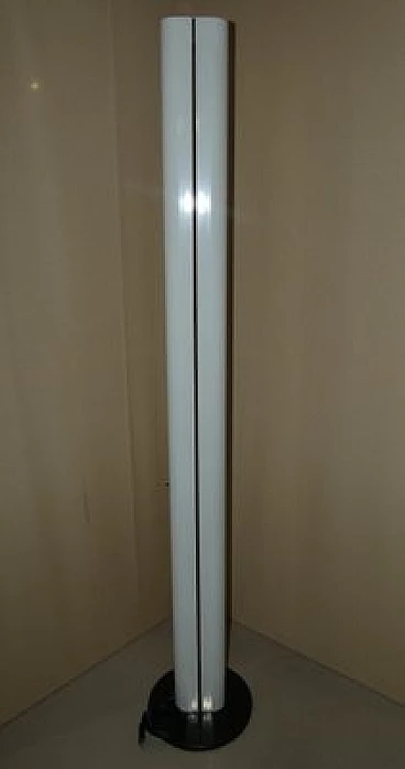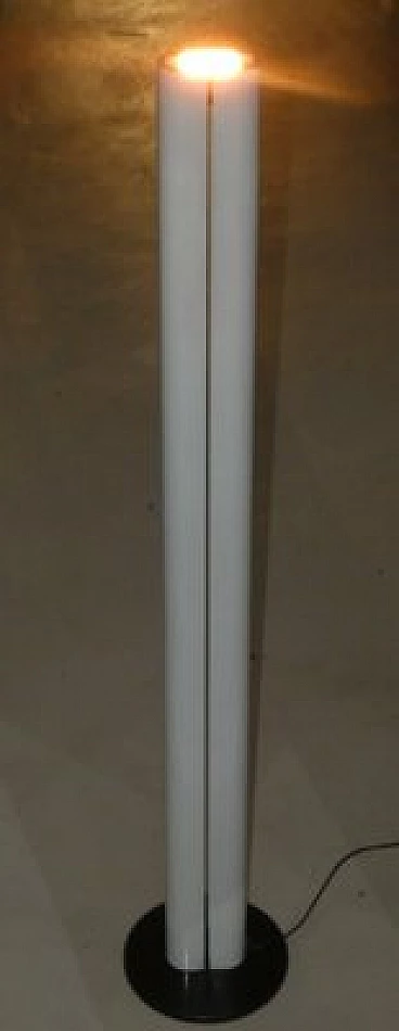 Megaron lamp designed in 1979 by Gianfranco Frattini for Artemide. The Megaron floor lamp is a true classic of the Artemide brand, designed in 1979 by the famous Italian designer Gianfranco Frattini. Ultra-minimal indirect light with a steel base covered in thermoplastic resin and a polished white painted aluminium body a pure design that beautifully highlights the light coming out of the top of the tube.