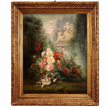 French still life from the second half of the 19th century. Oil painting on canvas depicting still life with flowers, a view of a classical garden with putti sculptures in the background. In the centre of the composition is a splendid bouquet of flowers with a pretty cat in the lower part (see photo). Painting of good luminosity characterised by vivid colours, signed at lower right (see photo), signature under study. Carved and gilded wood and plaster frame (bronze tinting) of great decoration, with some signs of time (see photo). Painting that has undergone conservative restoration with colour restoration in places and patches on the back (see photo), overall in good condition. Light painting H 80 x W 63 cm.