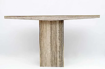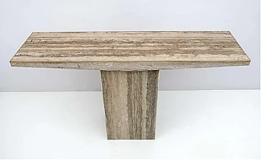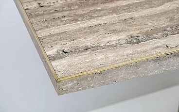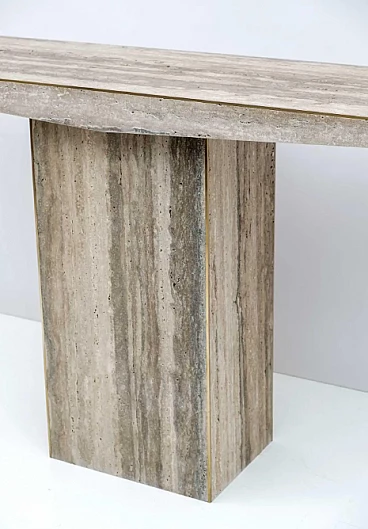 Pair of unfilled travertine and brass inlay console tables, 1970s