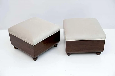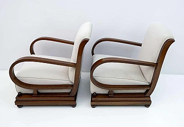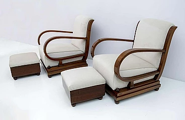 Pair of Art Deco armchairs and ottomans in walnut and velvet, 1920s