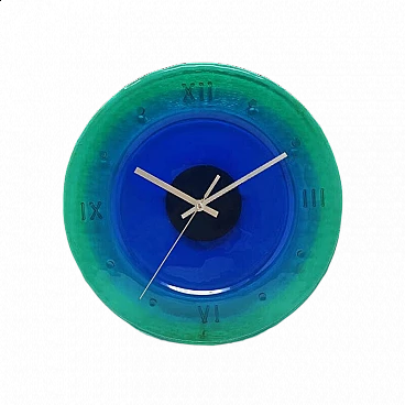 Blue and green Murano glass wall clock by Ca' dei Vetrai, 1960s. Quartz mechanism. It requires one AA battery.