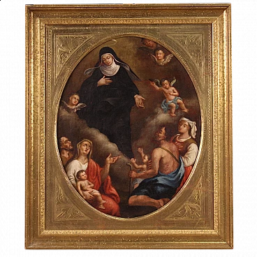 Old Italian painting from the 18th century. Oil on canvas glued on wooden panel depicting religious subject, Adoration of Saint, of good pictorial hand. Oval painting adorned with a non-coeval, 20th century, rectangular frame with carved and gilded wooden passe-partout. Work depicting a holy nun in heaven surrounded by cherubs and putti. In the lower part we find the faithful in adoration. A painting of a small size, which can easily be placed in various places in the house. Painting that underwent conservative restoration during the 20th century. In good condition. Light painting H 49 x W 38.5 cm.